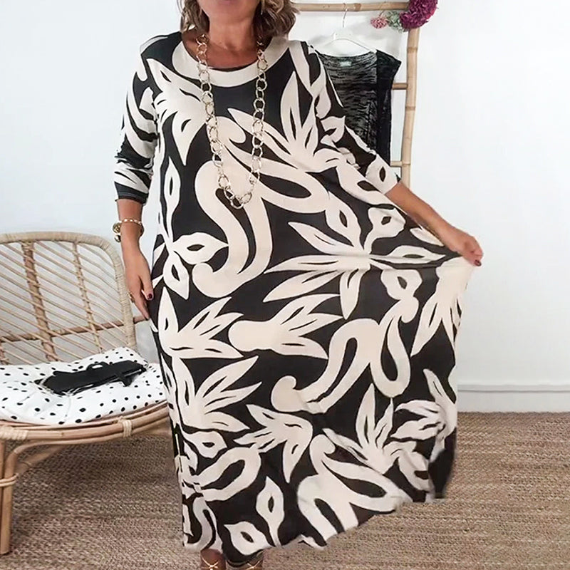 🌼Elegantiška, laisva, apvaliu kaklu, raštuota moteriška suknelė-LT
