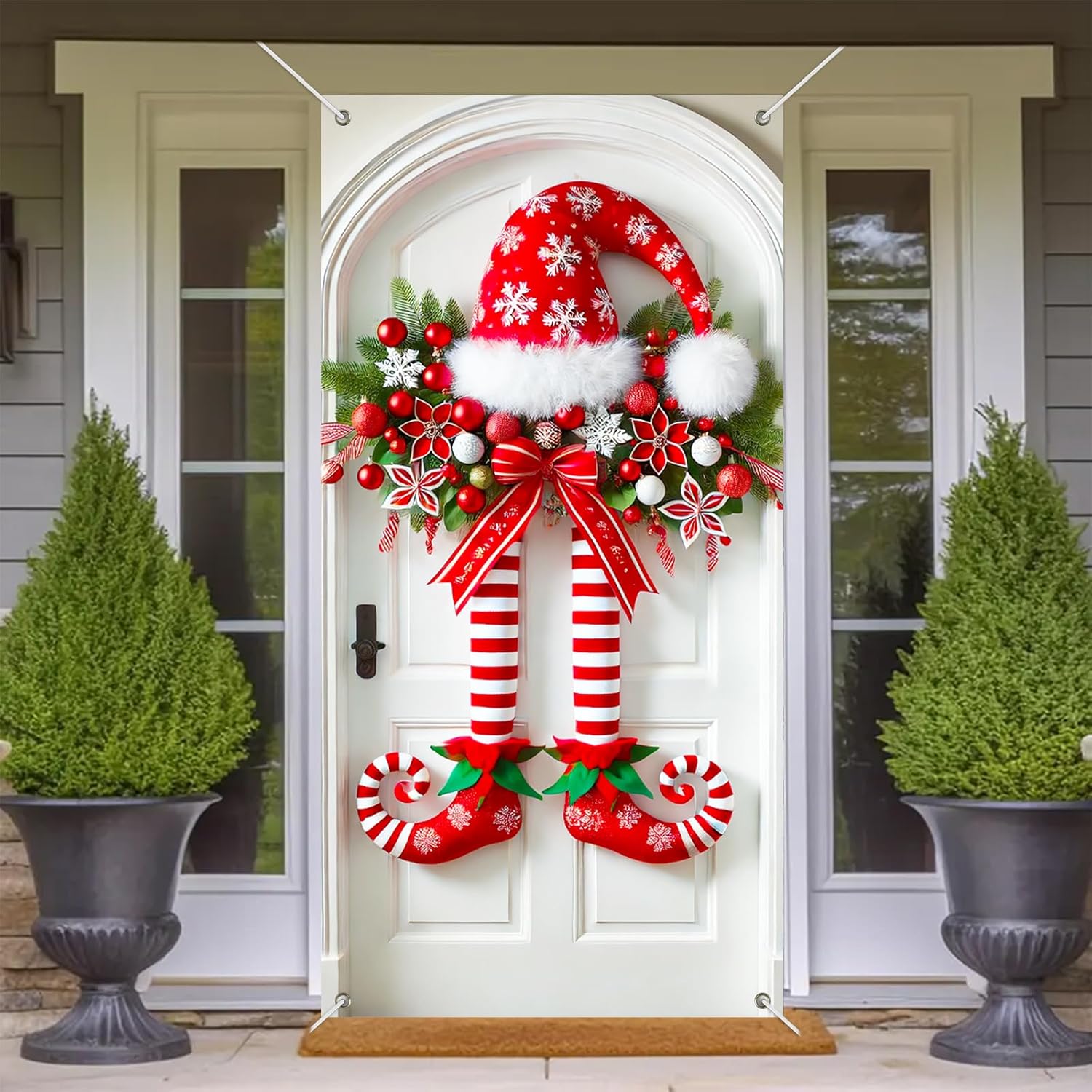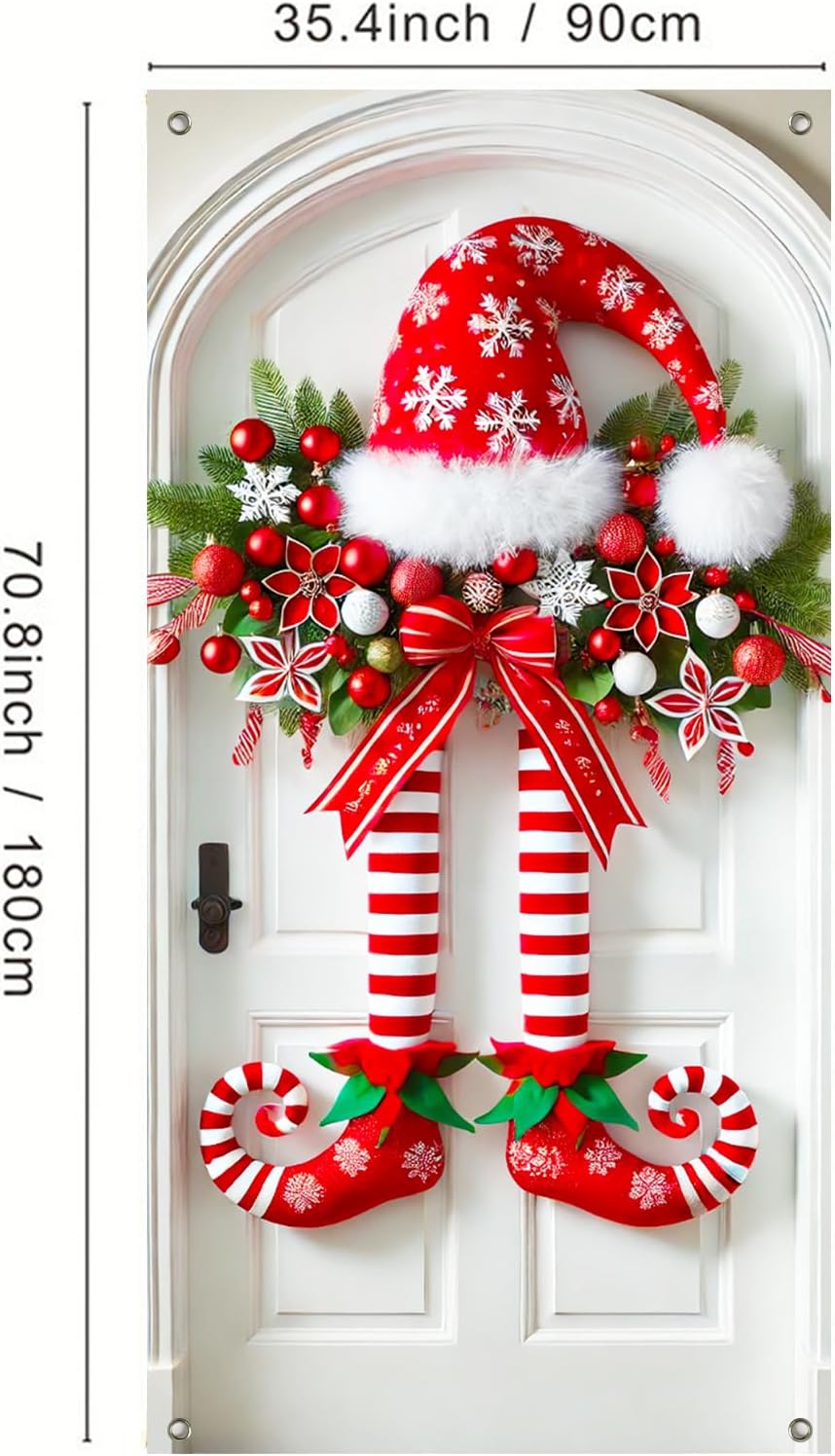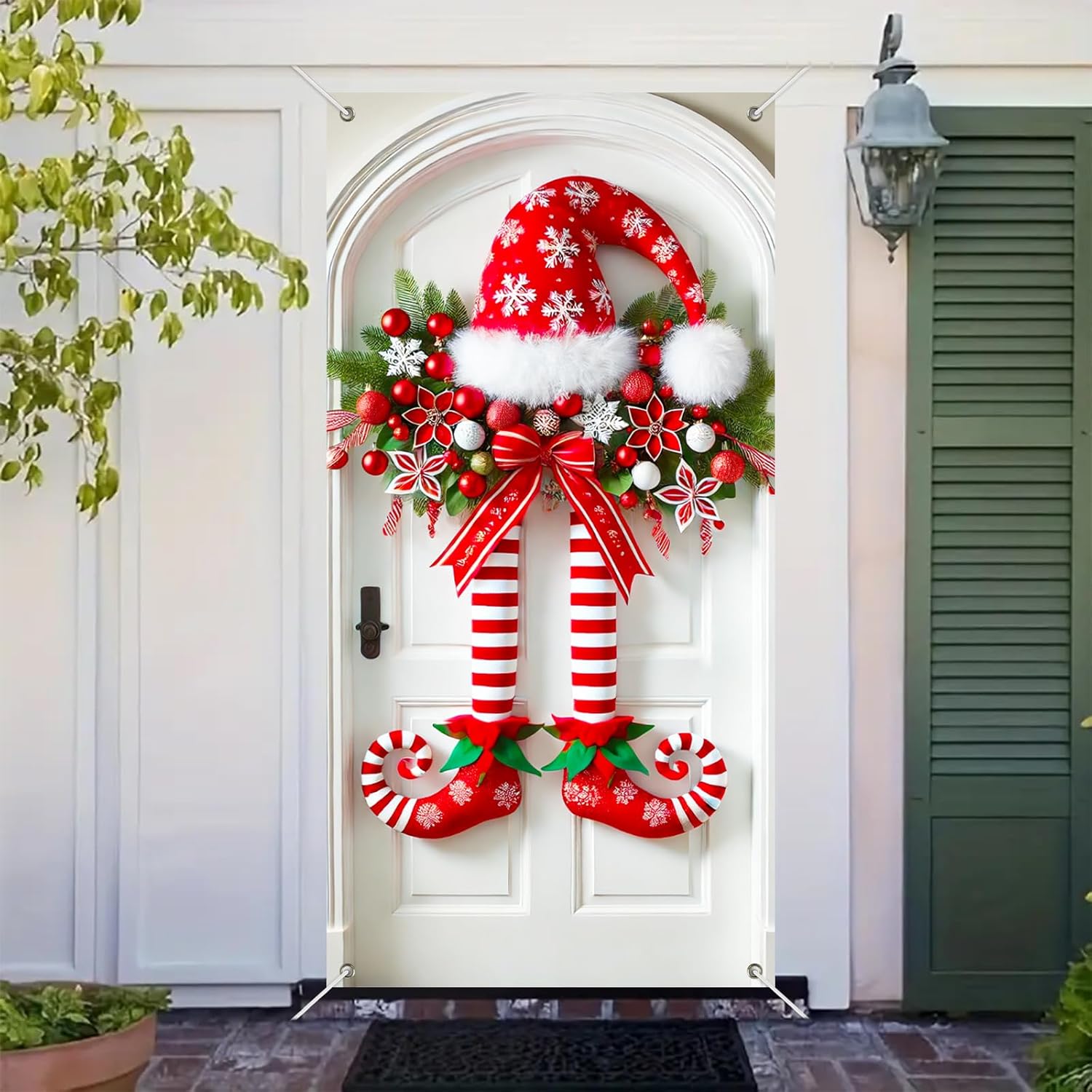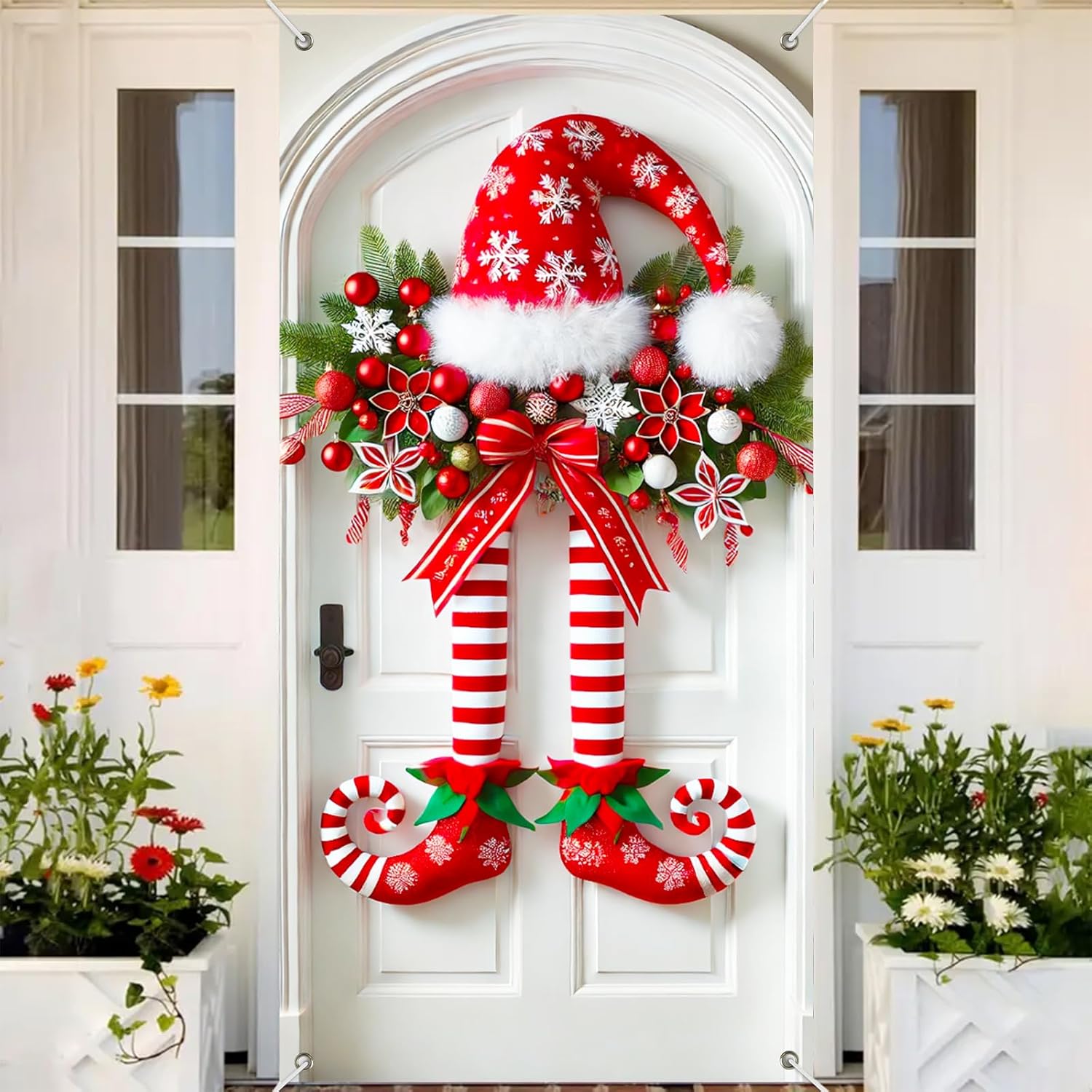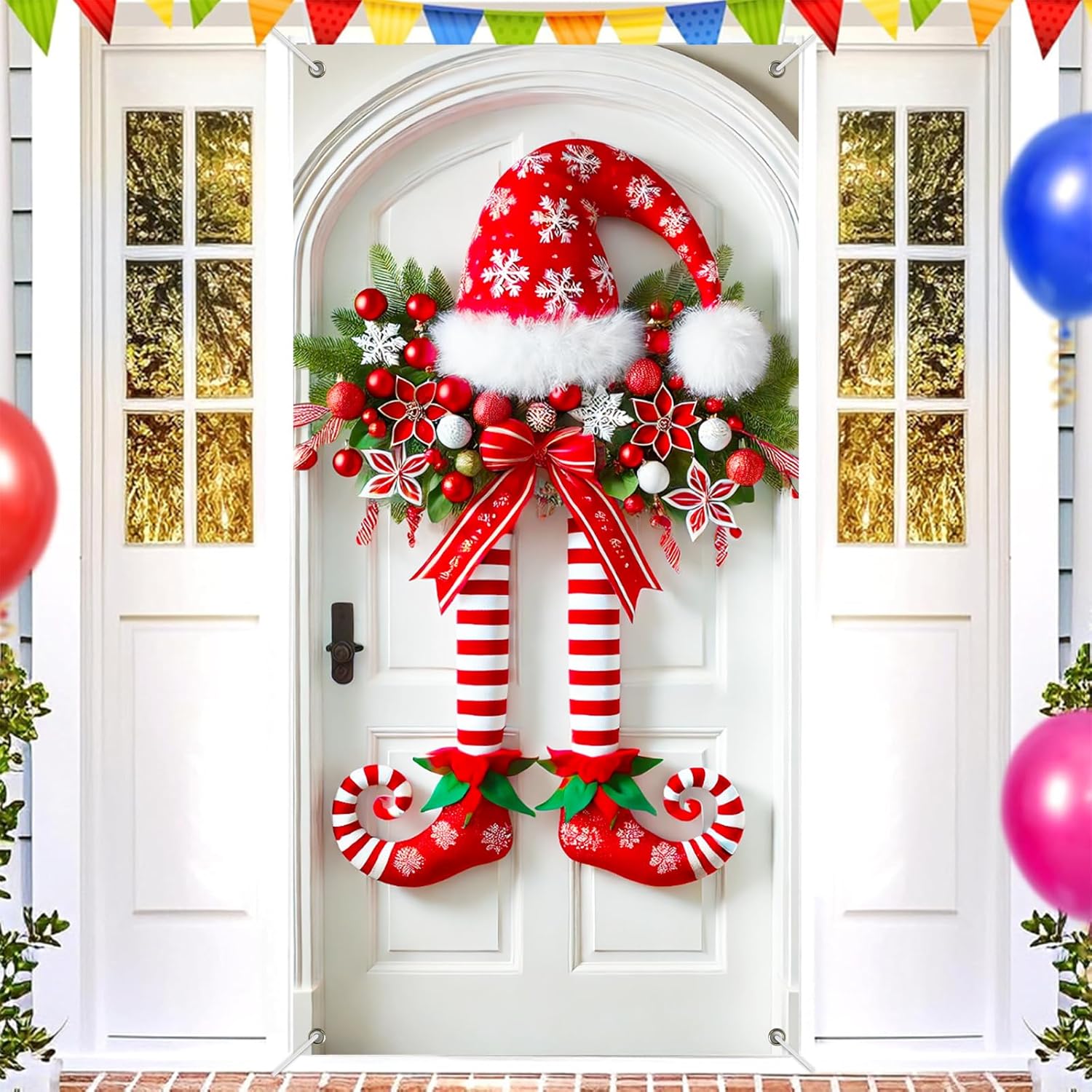 Zabavna oblika vilinskih nog: Ta transparent s črtastimi vilinskimi nogami, kodrastimi škornji, klobukom s snežinko in prazničnimi okraski ustvarja živahno božično vzdušje na vaši verandi ali zabavi.