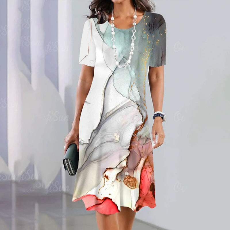 AKĮ PATRAUKIANČIO RAŠTO DIZAINAS: Ši suknelė pasižymi drąsiu, ryškiu raštu, kuris pabrėš jūsų stilių, sukurdamas modernų, elegantišką įvaizdį, puikiai tinkantį laisvalaikio išvykoms ar pusiau oficialiems renginiams.
