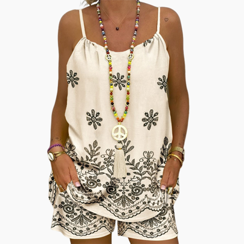 Paket vključuje 1* ženski potiskani top in kratke hlače z naramnicami.