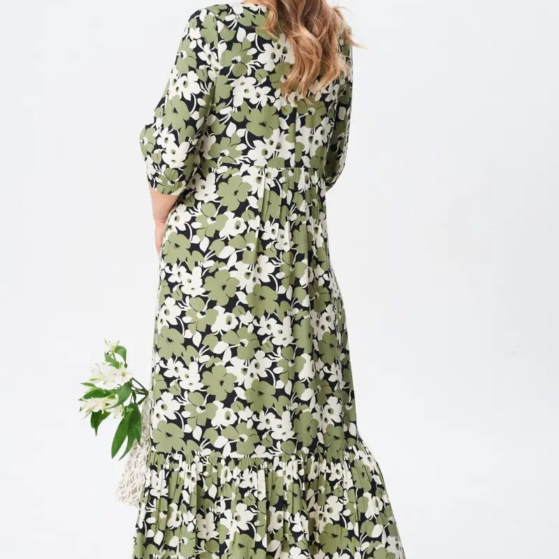 STILINGAS GĖLIŲ RAŠTAS: Ši suknelė pasižymi gražiu žaliu gėlių raštu, kuris jūsų garderobui suteiks gamtos elegancijos. Sudėtingas raštas yra ryškus, tačiau subtilus, puikiai tinka bet kokiai neformaliai išvykai ar socialiniam renginiui. Tai universalus drabužis, kuris lengvai dera su basutėmis, sportbačiais ar aukštakulniais, todėl yra būtinas pavasario ir vasaros atributas.