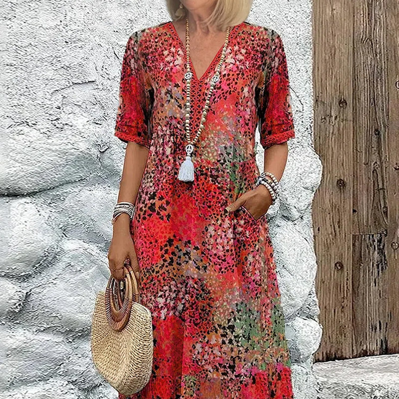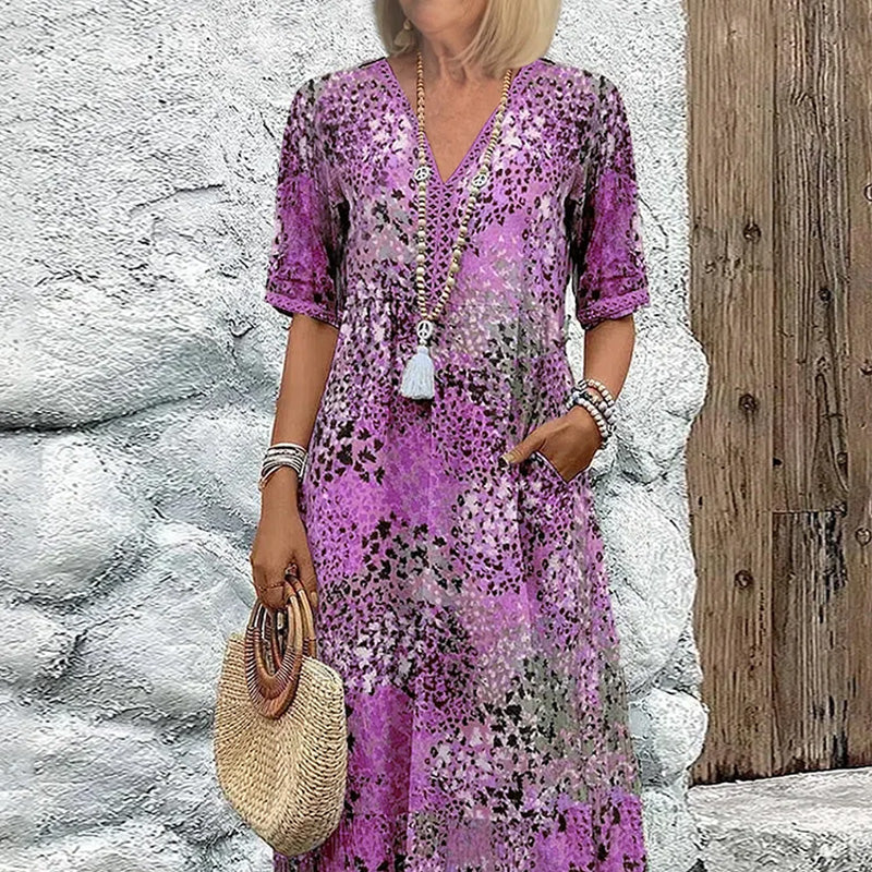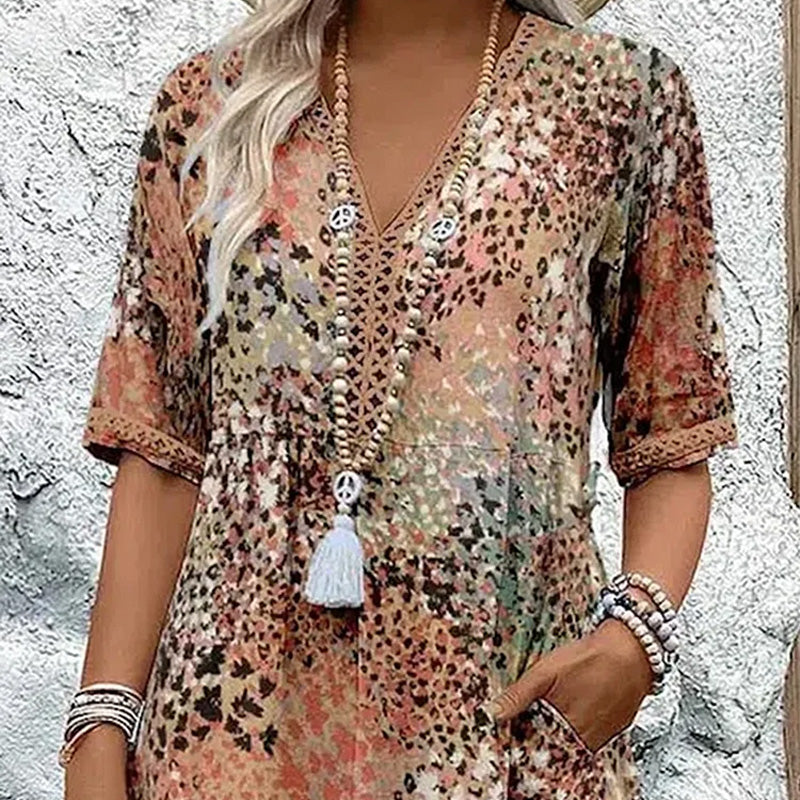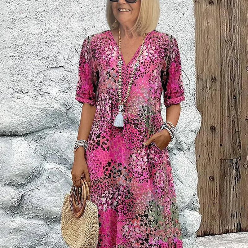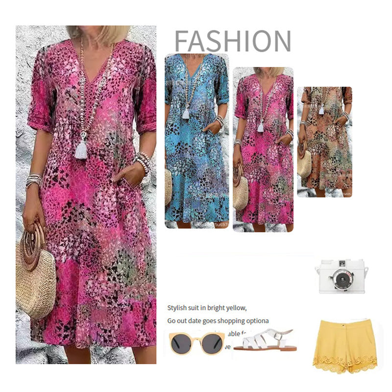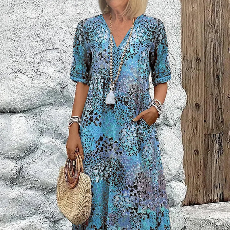 Į komplektaciją įeina: 1*Moteriška suknelė su šviesiu raštu ir V formos iškirpte