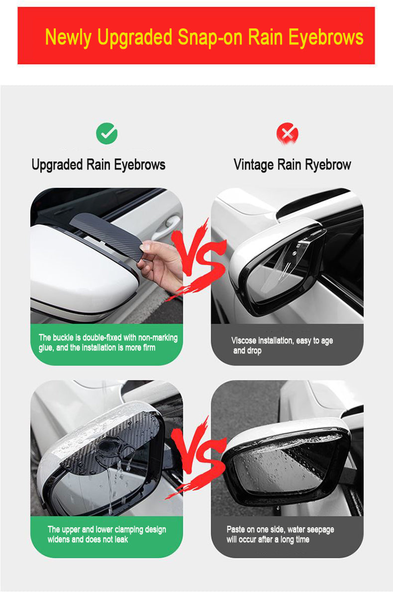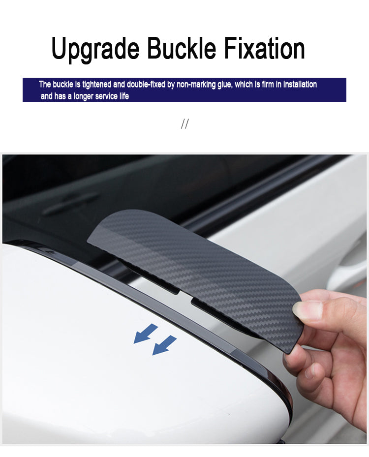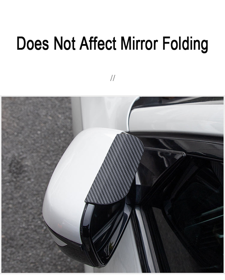 2 lietaus nepraleidžiančios plėvelės su naujomis sagtimis, specialiais klijais pagalbiniams automobiliams, saugios, paprastos ir tvirtos. Gaminys pagamintas iš anglies pluošto medžiagos, kuri yra draugiška aplinkai. Juoda spalva gali būti derinama su bet kokios spalvos veidrodėliais. Po montavimo ji neturės įtakos galinio vaizdo veidrodėlio sulankstymui ir neužstos matymo linijos.