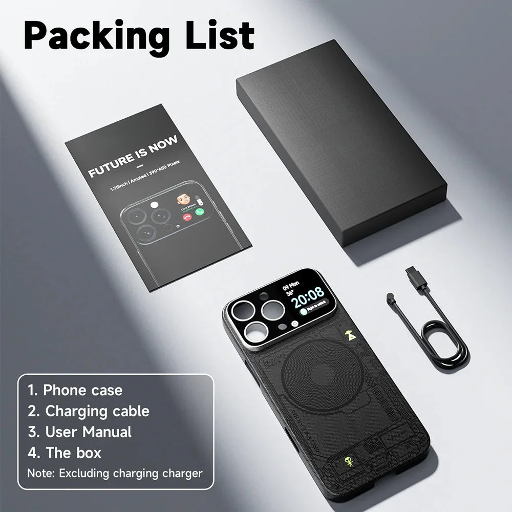 Ovitek Smart Window: Ta ovitek za pametni telefon naslednje generacije, ki je eleganten kot iPhone 17, združuje zaščito, slog in pametno funkcionalnost. Z 1,75-palčnim zaslonom AMOLED HD Smart Window si lahko predogledate klice in sporočila ter celo upravljate predvajanje glasbe, ne da bi odklenili telefon. Funkcije pametnega okna: Funkcija predogleda kamere Bluetooth vam omogoča enostavno fotografiranje in ogled predogledov v realnem času na pametnem oknu. Uporabna orodja, kot so glasba, vreme, kalkulator in časovnik, so vedno na dosegu roke. Izjemno močna magnetna sila: Ovitek ima vgrajen jekleni obročasti magnet, ki zagotavlja varno povezavo s polnilniki MagSafe in magnetnimi nosilci. Uživajte v gladkem polnjenju in stabilni stabilnosti kadar koli in kjer koli. Podpora za brezžično polnjenje: Zahvaljujoč uradnim magnetom N45SH se ovitek brezhibno pritrdi na vaš brezžični polnilnik. Preprosto napolnite telefon in zagotovite celovito zaščito. Popolno ravnovesje med tankostjo in zaščito. Ta ovitek je bil skrbno zasnovan tako, da zagotavlja popolno ravnovesje med tankostjo in robustno zaščito. Zmanjšuje velikost, hkrati pa zagotavlja maksimalno zaščito pred padci, praskami in udarci. Zaščita kamere. Dvignjeni robovi zagotavljajo izboljšano zaščito objektiva in zaslona fotoaparata, kar zagotavlja jasne fotografije in varuje vašo napravo. Vrhunski material, odličen oprijem. Ta zaščitni ovitek je izdelan iz aramidnih vlaken 600D vojaškega razreda, ki ponujajo izjemno trdnost, vzdržljivost in nedrseč oprijem. Je dovolj lahek in vzdržljiv, da prenese vsakodnevno obrabo. Kako polniti ovitek: Ovitek ima vgrajeno baterijo s kapaciteto 170 mAh. Preprosto jo napolnite z magnetno polnilno postajo. Je hitro, varno in priročno. Pogosta vprašanja: Kako ovitek povežem s telefonom? O: Prenesite spremljevalno aplikacijo. Ko je povezan, lahko uporabljate pametne funkcije, kot so obvestila, upravljanje glasbe, vreme, kalkulator in predogledi fotoaparata. V: Kako napolnim ovitek Smart Window? O: Ovitek ima vgrajeno baterijo s kapaciteto 170 mAh. Polnite jo s priloženo magnetno polnilno postajo. Telefon lahko še vedno polnite s standardnimi brezžičnimi ali žičnimi načini polnjenja. V: Kako pogosto naj polnim ovitek Smart Window? O: Pri normalni uporabi naj bi eno polnjenje zdržalo približno 2–3 dni. Za hitro, varno in priročno polnjenje preprosto uporabite magnetno polnilno postajo