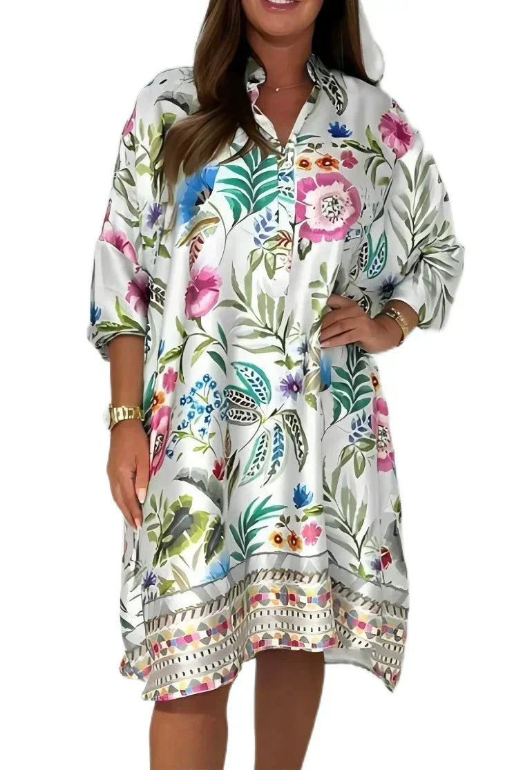 Į komplektą įeina: 1 * Gėlėta laisva suknelė V formos iškirpte ir sagų užsegimu
