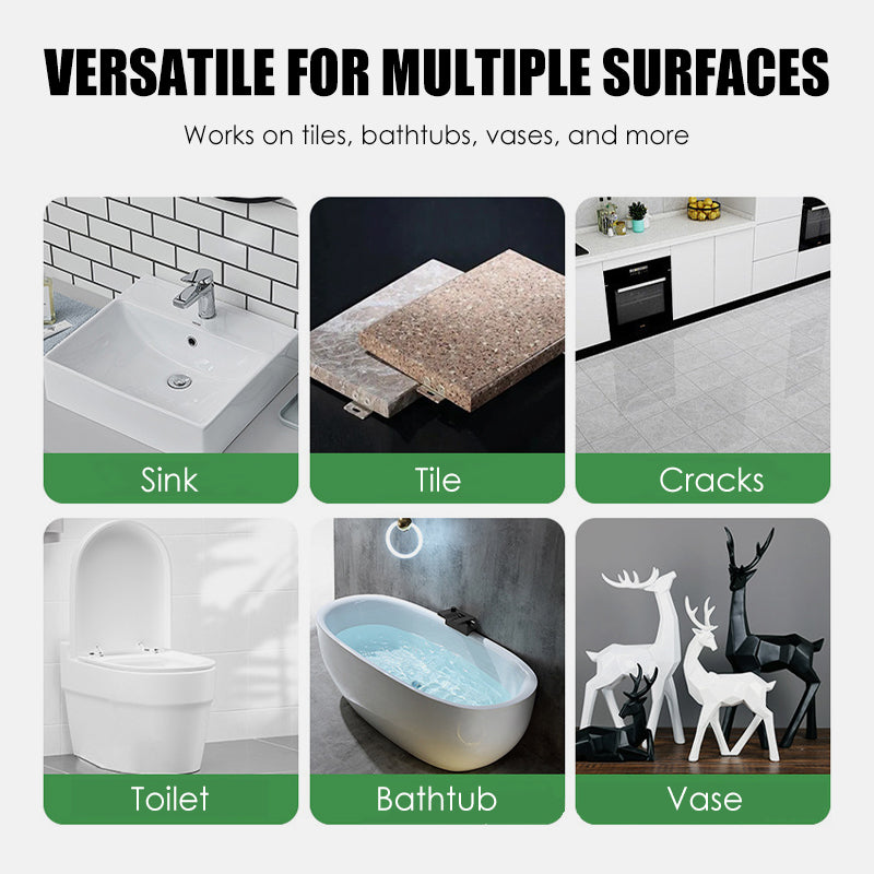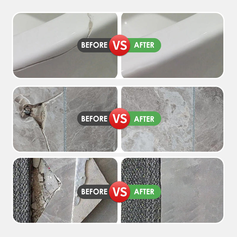 POPRAVILO RAZPOKE KOT NOVE – Popravilo poškodb še nikoli ni bilo lažje. Naša napredna formula hitro odpravi razpoke, odkruške in luknje na ploščicah, kopalnih kadeh, straniščih in drugih površinah. Po uporabi bodo površine videti kot nove, brez kakršnih koli znakov poškodb. Prihranite denar in se izognite zamenjavi – obnovite svoje predmete v nekaj minutah.