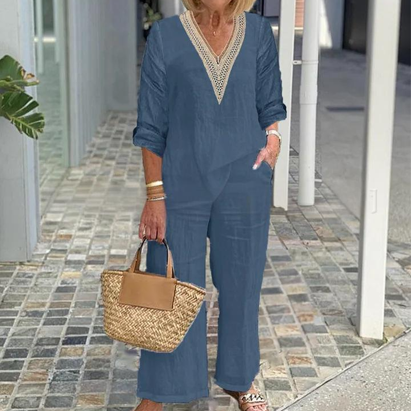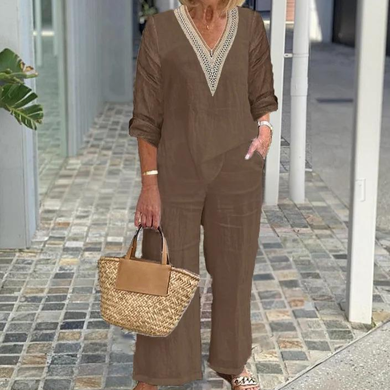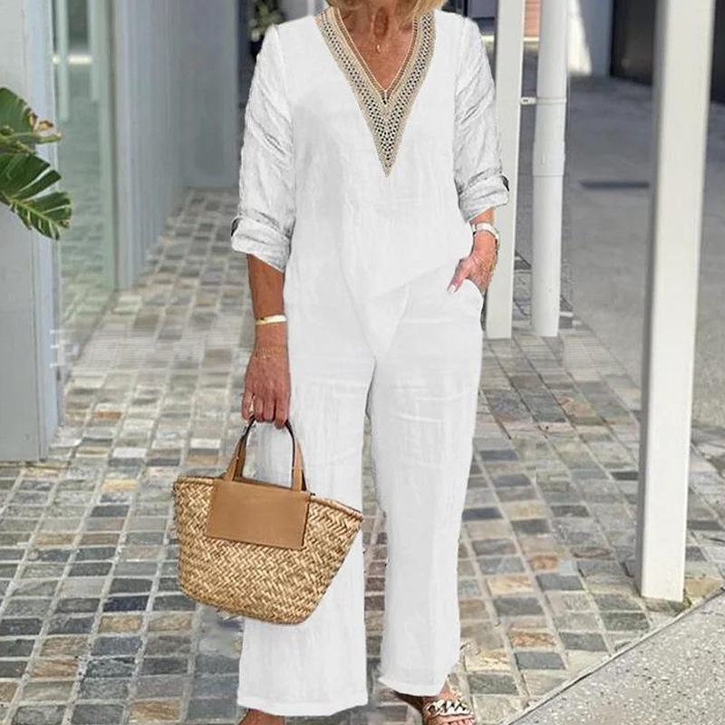 Komplet vsebuje: 1* Ženski top z V-izrezom in široke hlače
